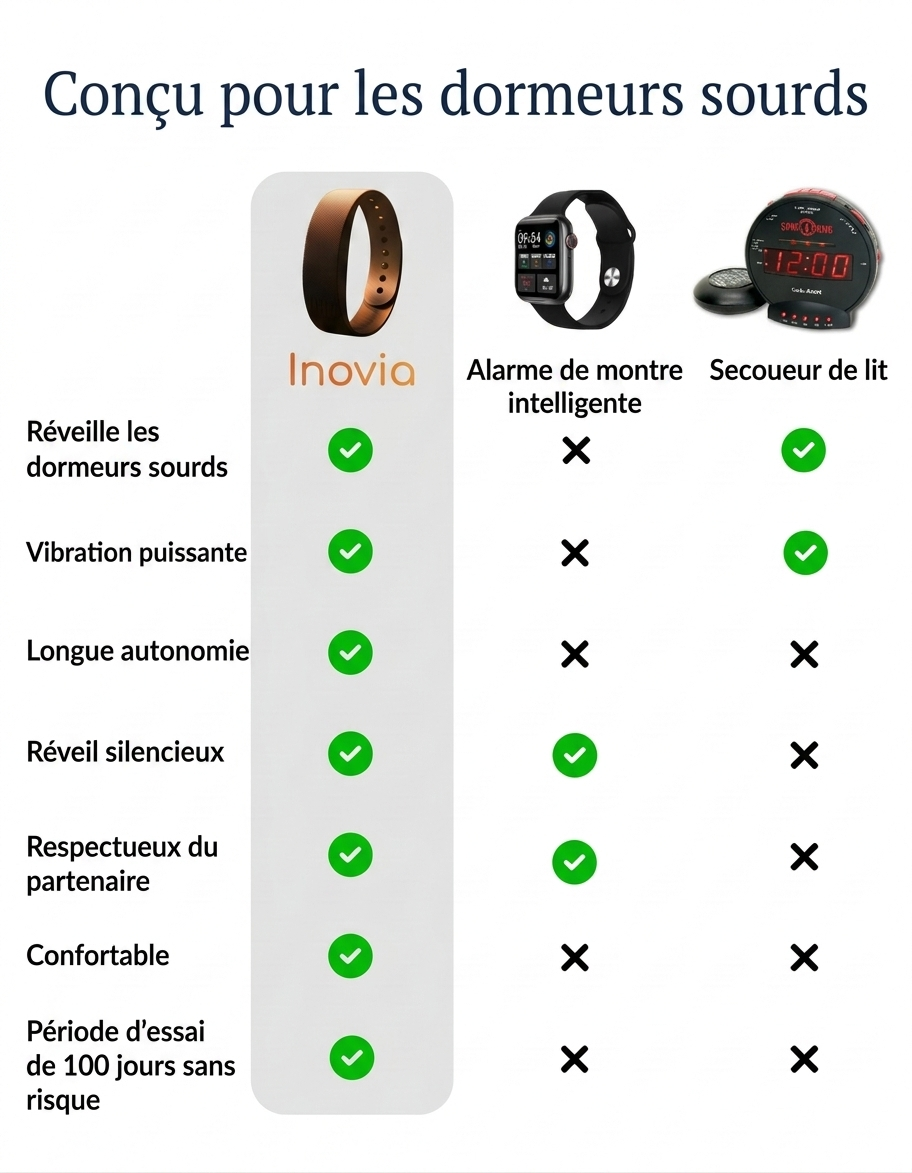 Non. La vibration d’Inovia est différente : contrairement à un vibreur de lit qui fait vibrer tout le matelas, elle ne vibre que sur votre poignet. 89 % de nos clients indiquent qu’ils se réveillent sans déranger leur partenaire.