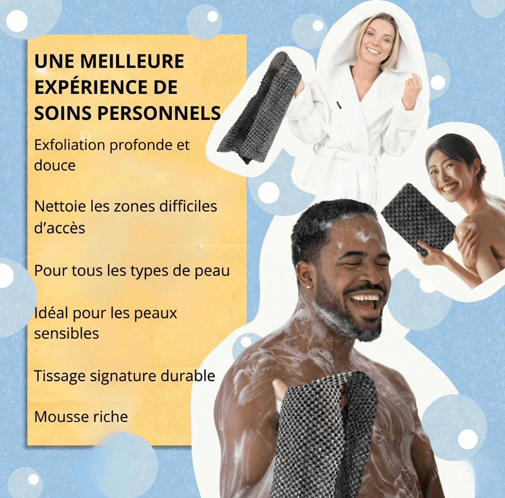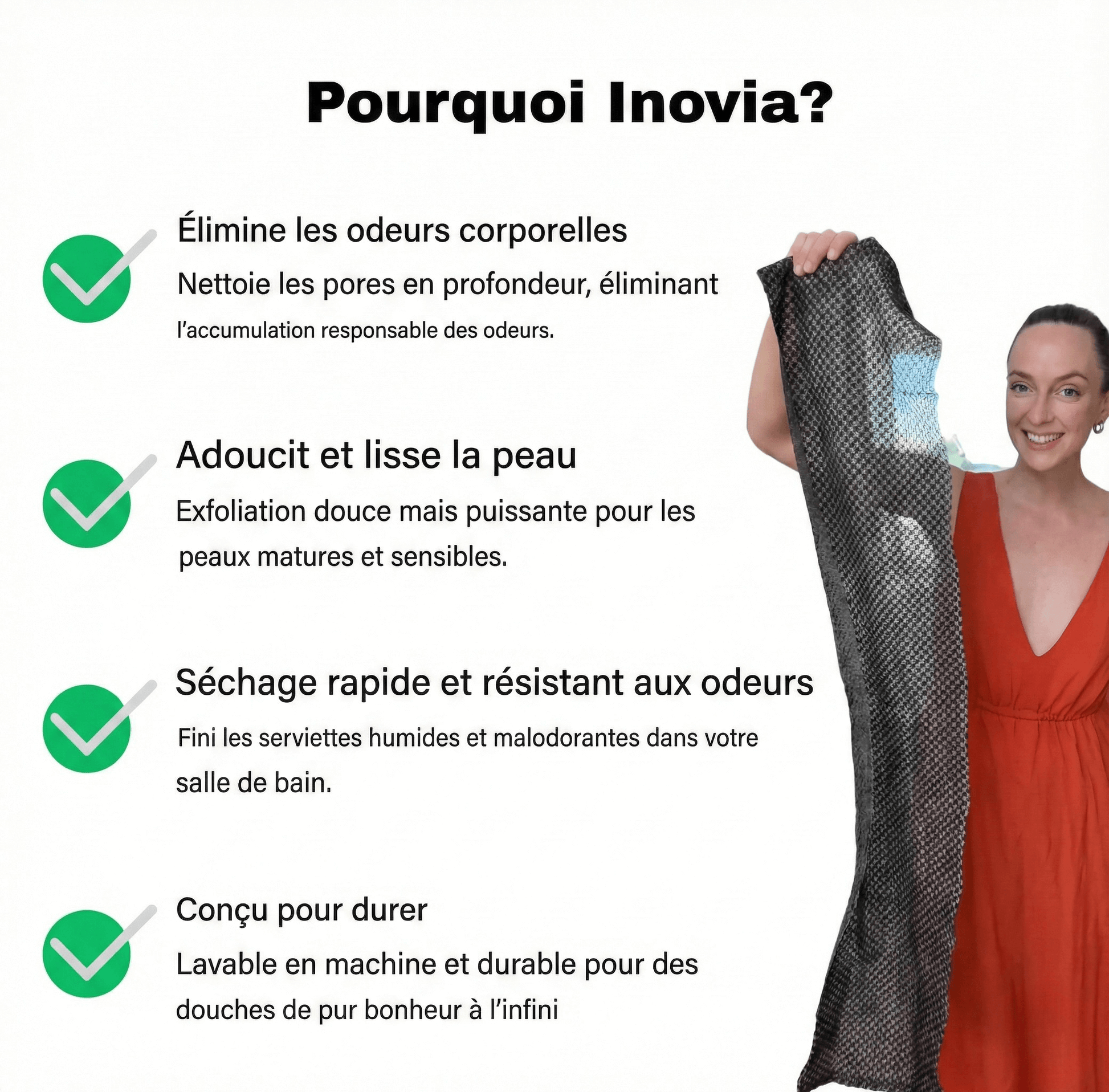 "Jetez tous vos produits d'exfoliation. Tout se résume à cette serviette. C'est unz serviette incroyable. Après la première utilisation, ma peau était lisse, plus douce, et toutes les peaux mortes avaient disparu. Même mes problèmes de peau aux coudes se sont nettement améliorés. Produit incroyable, prix imbattable. Je recommande vivement Inovia."